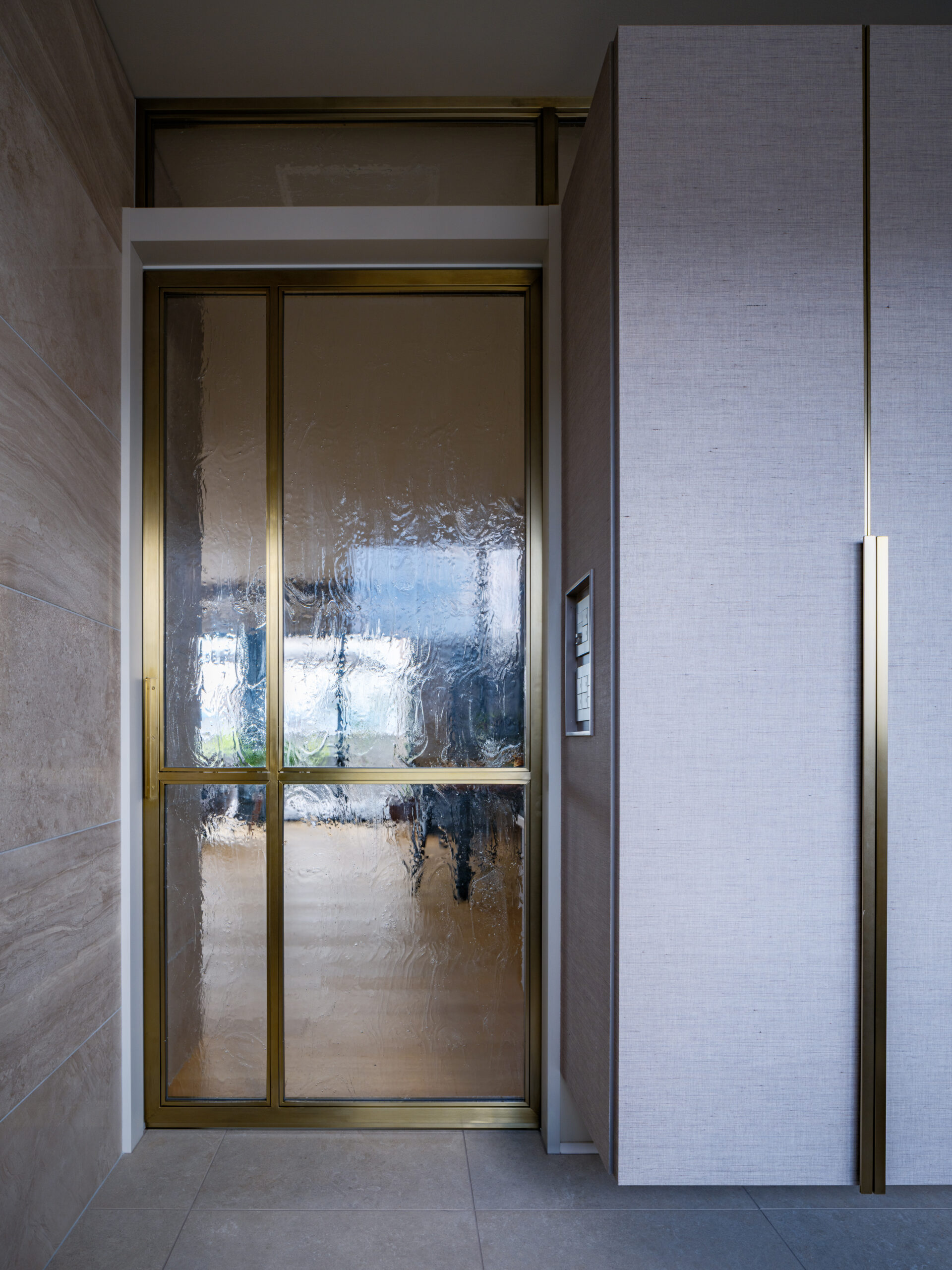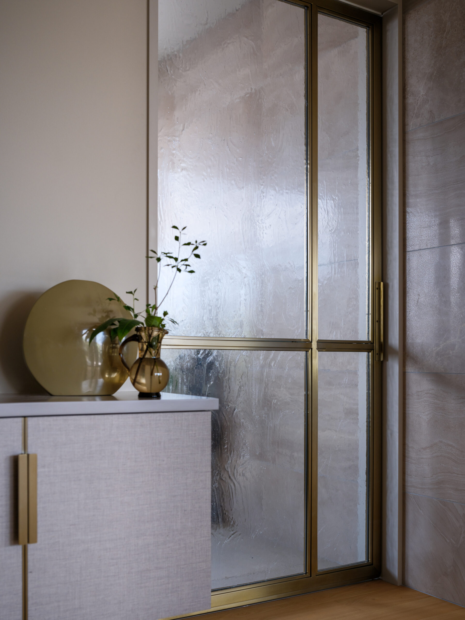 扉にはファブリックを張り取手は真鍮を採用。