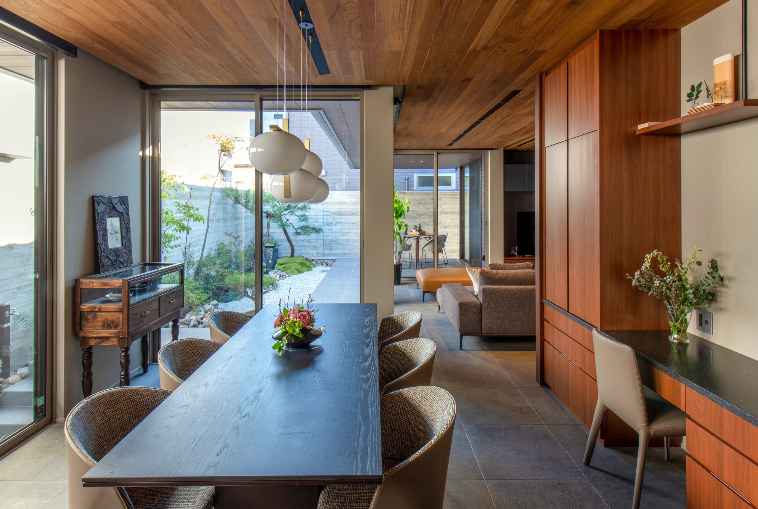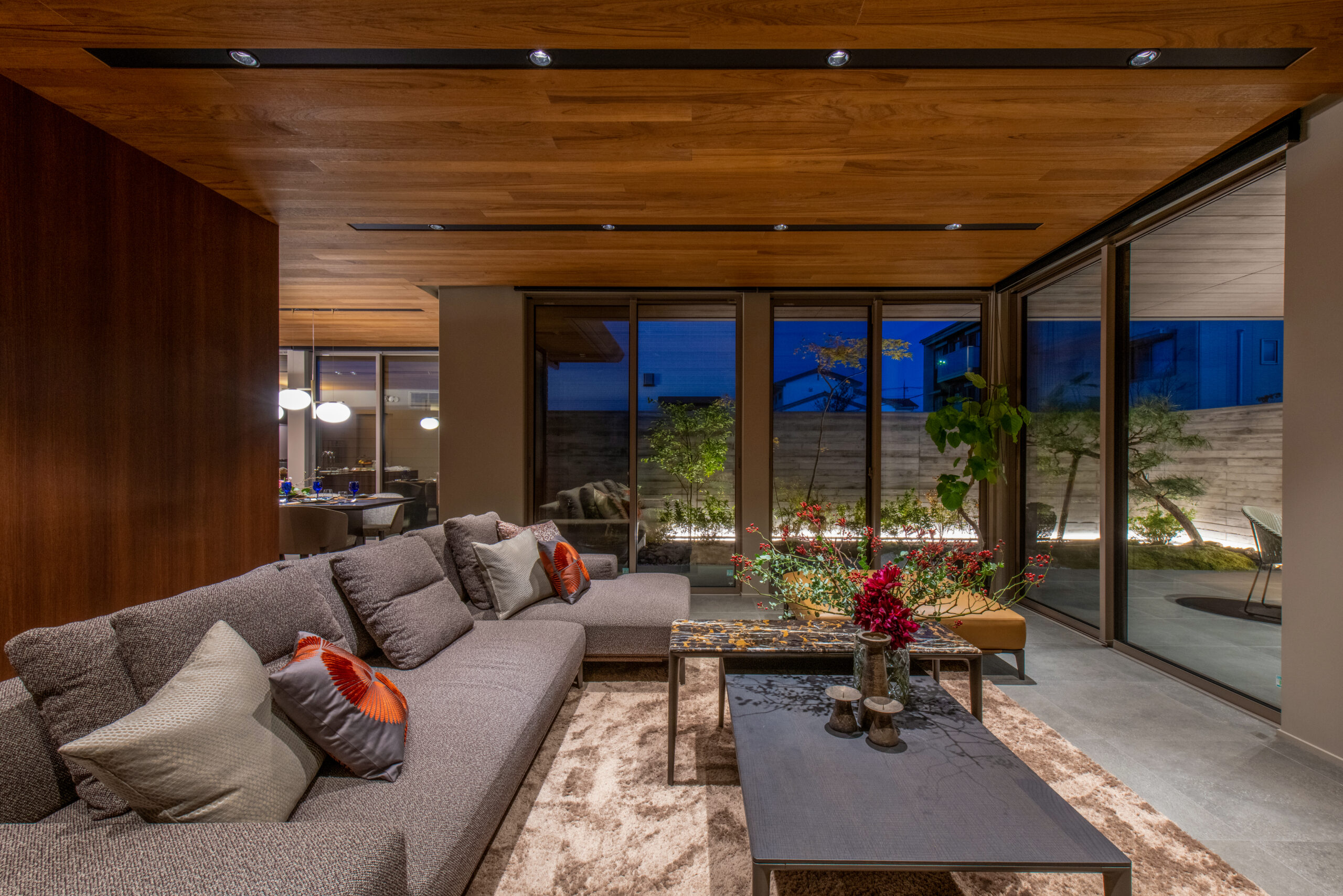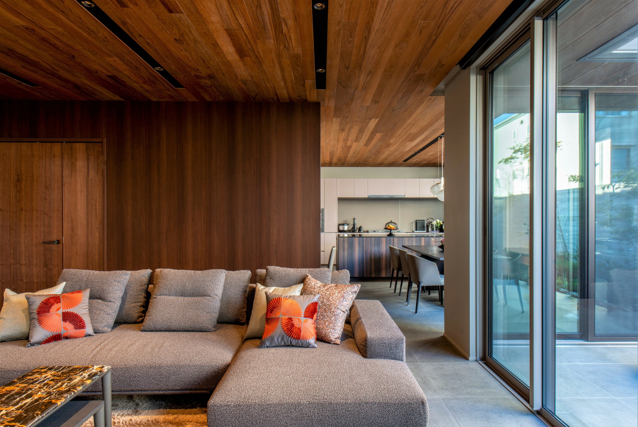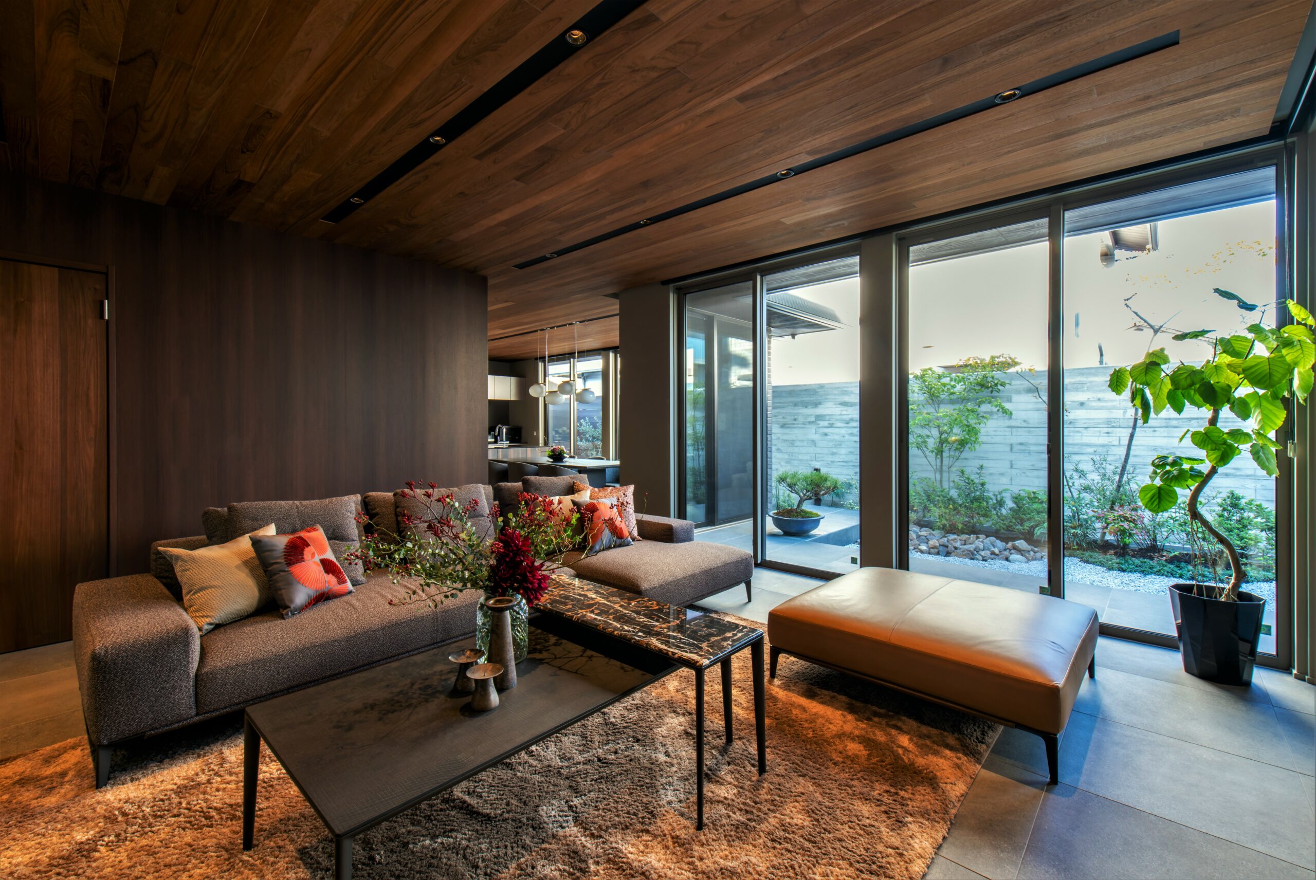 開放的なLDKは壁と天井に板張りを施し重厚感と