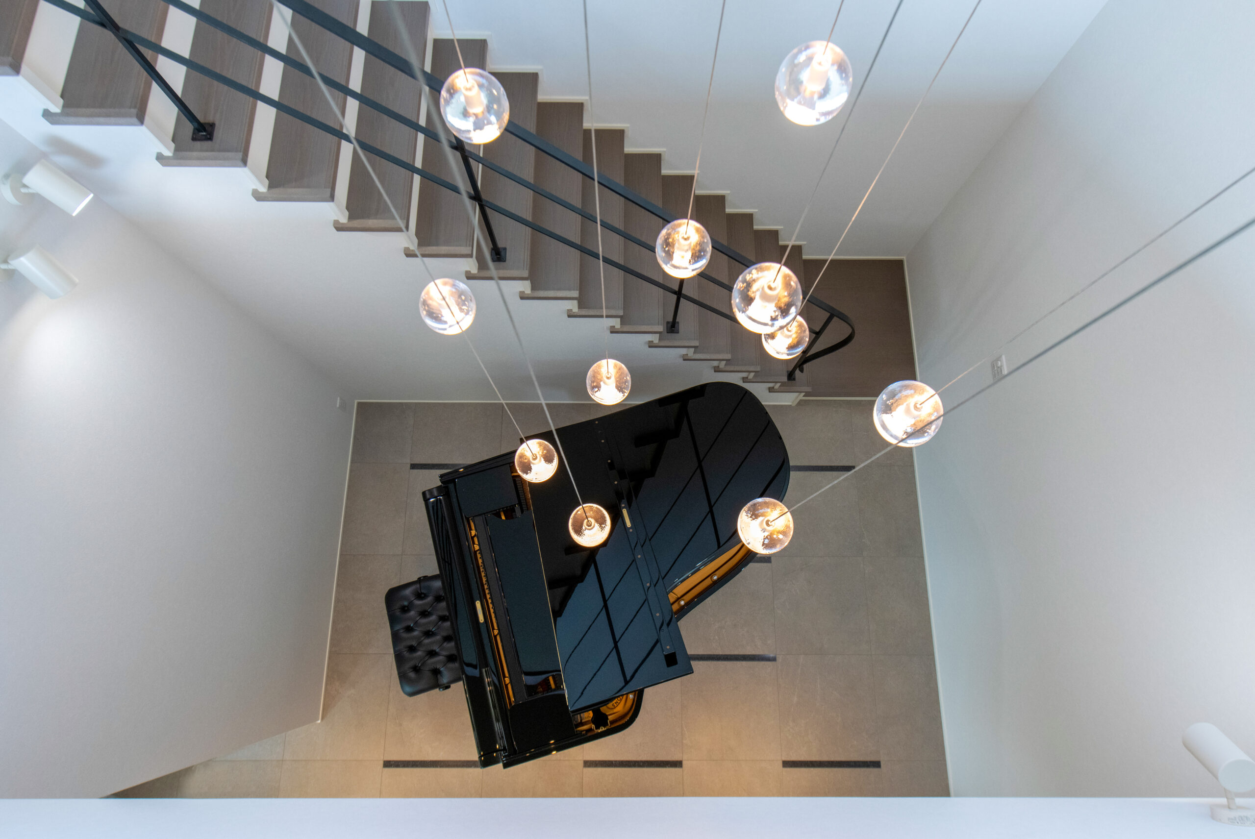 時には演奏会もされるという事で床はさりげない装いのデザイン貼り、天井からはBOCCHIのペンダント照明で華やかさを演出しました。