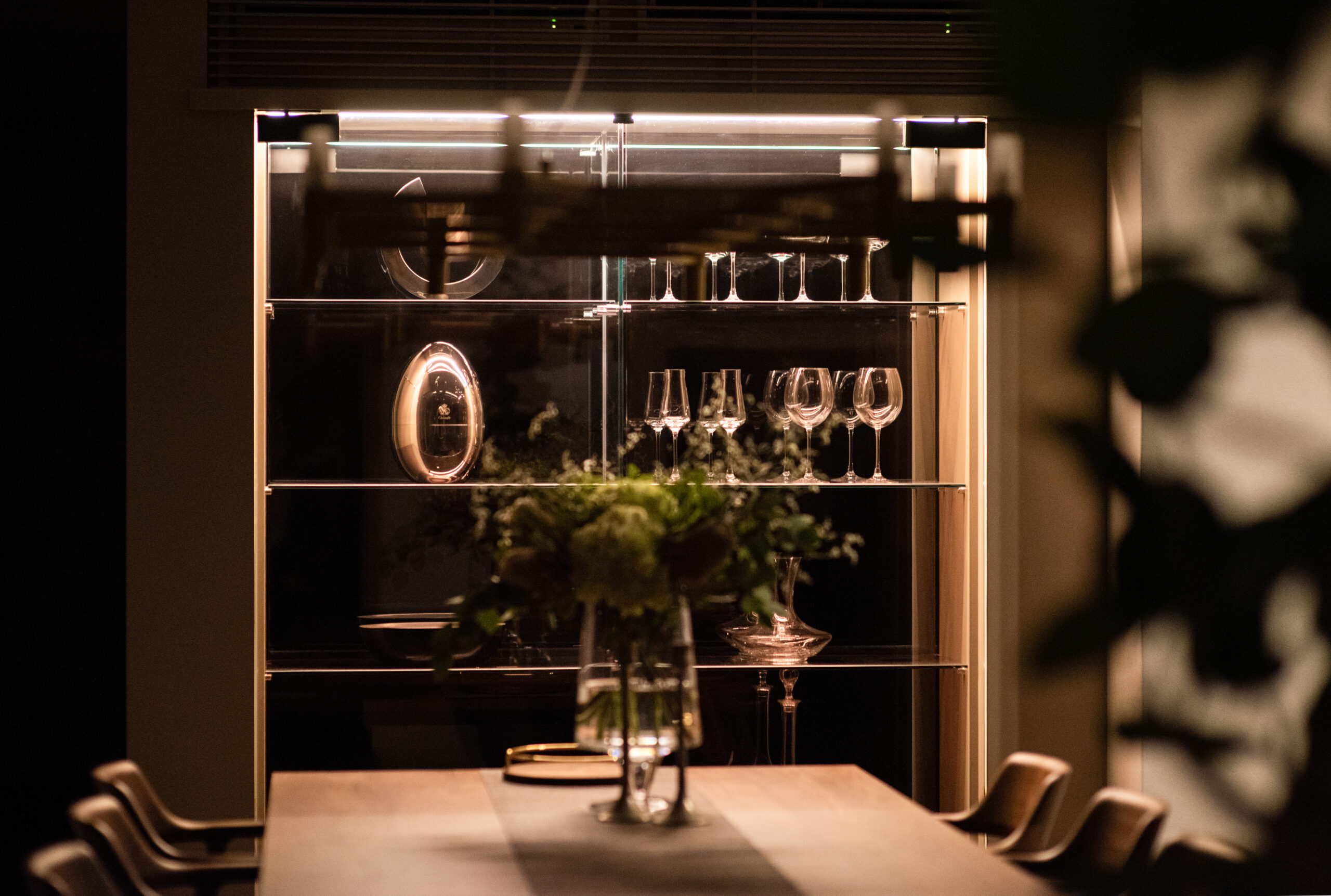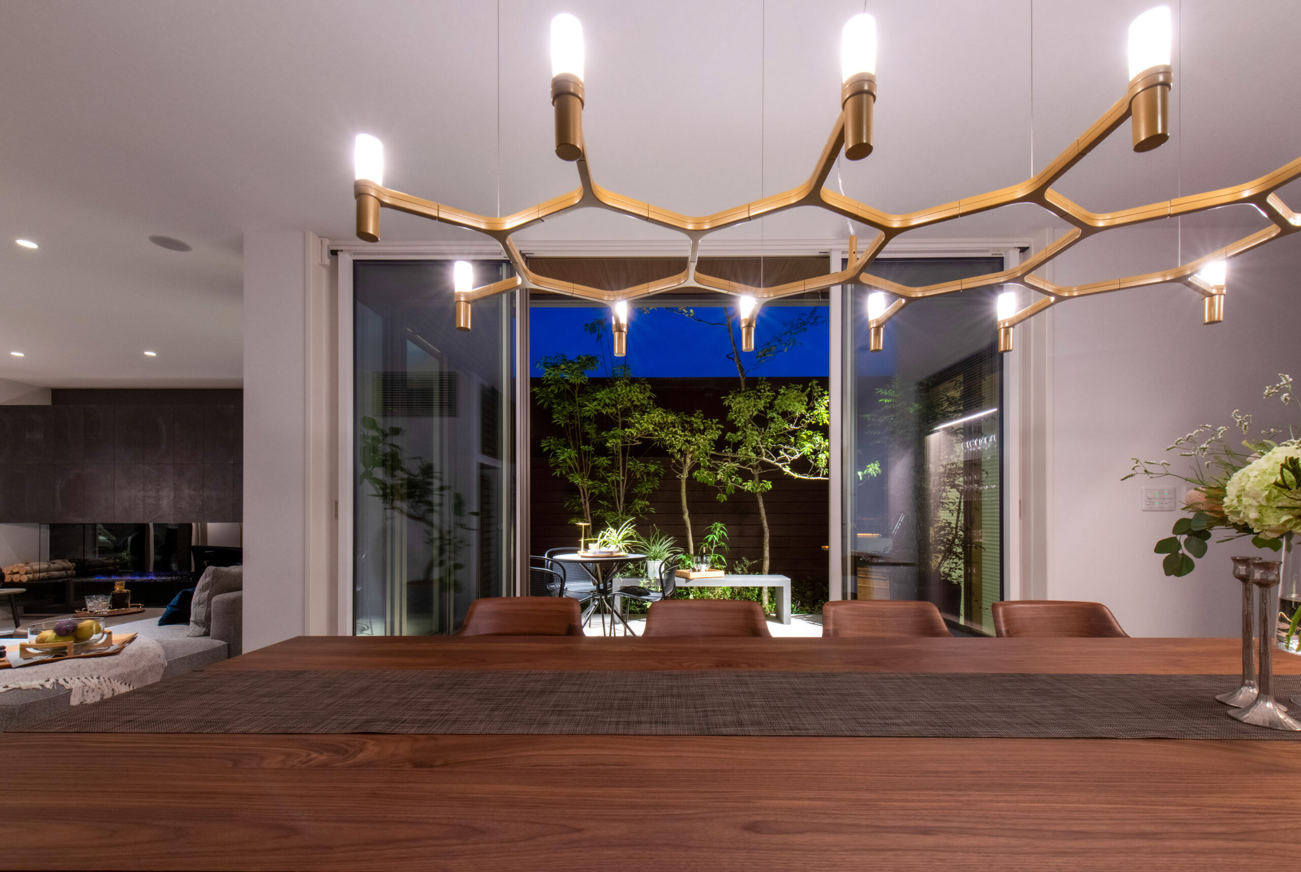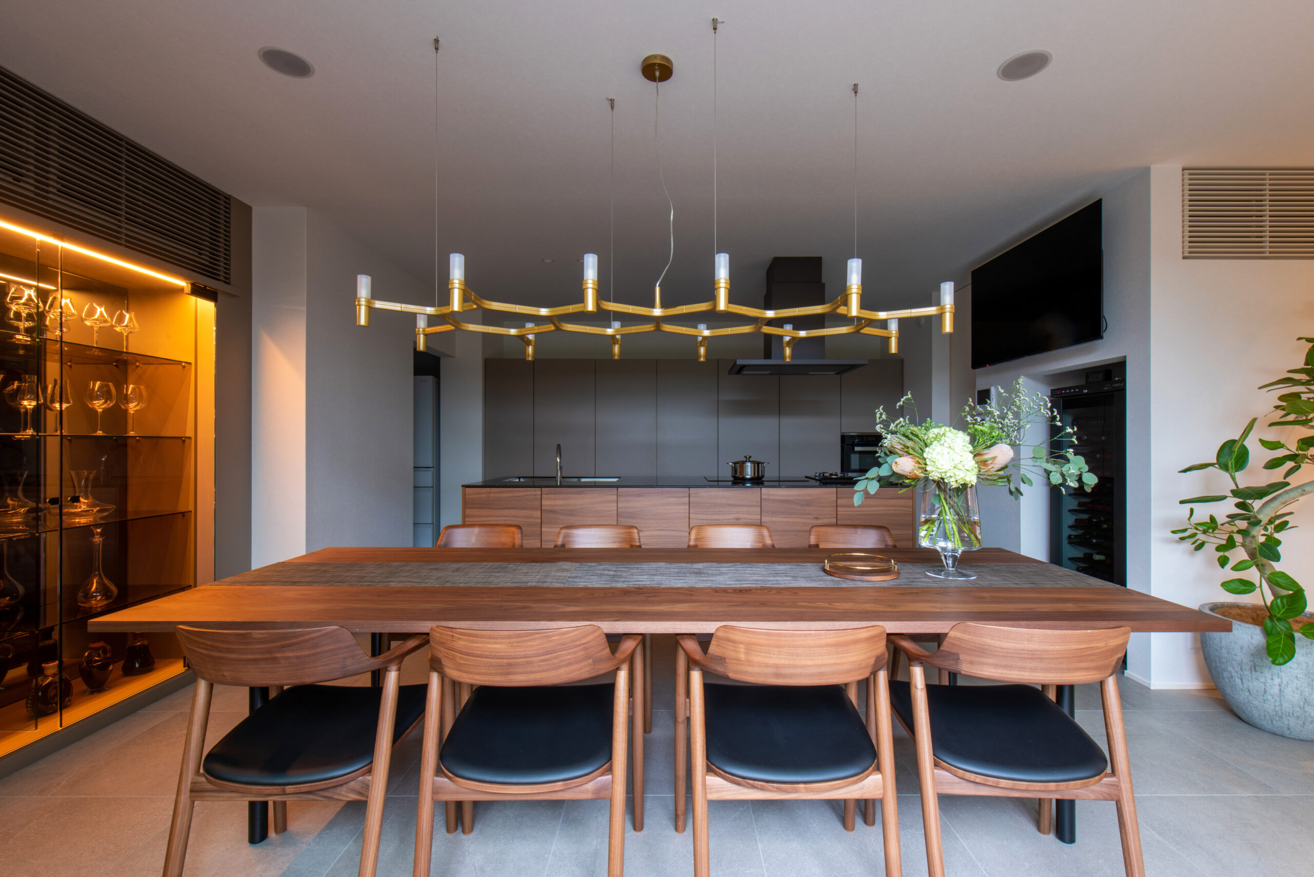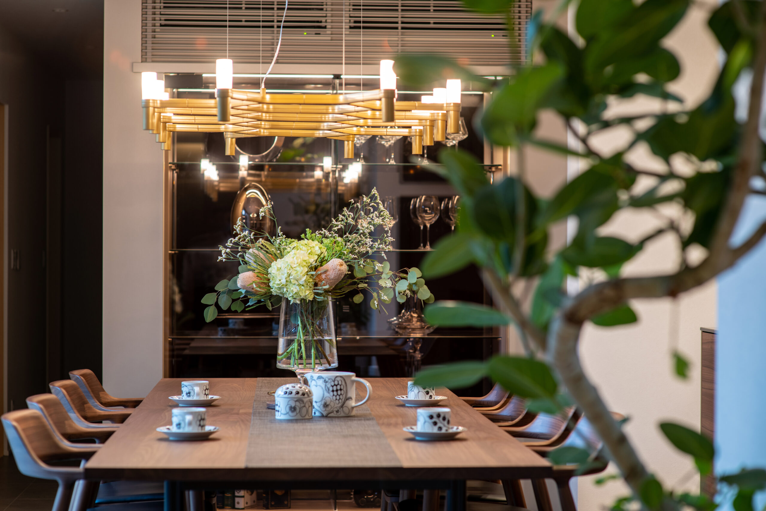 ダイニングには印象的なペンダント照明とガラスのショーケースでモダンの中にもエレガントな雰囲気を取り入れ全体をまとめています。