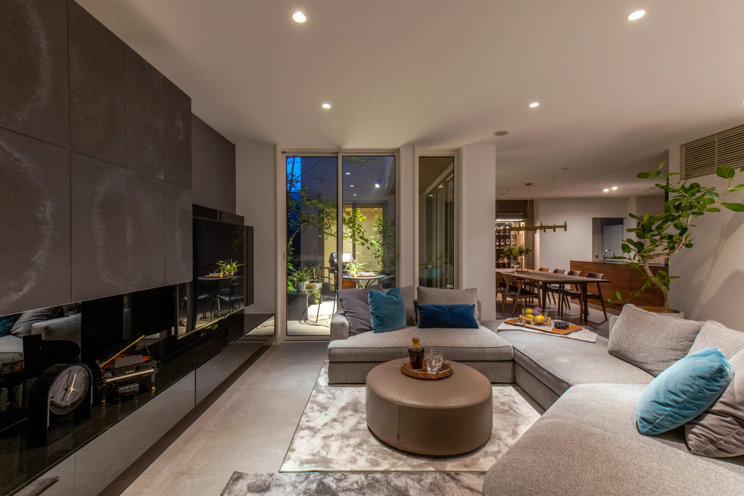 ソファは正面とピアノ側と2方向に座れるようにし、ピアノを弾く側も聴く側も楽しめるように。